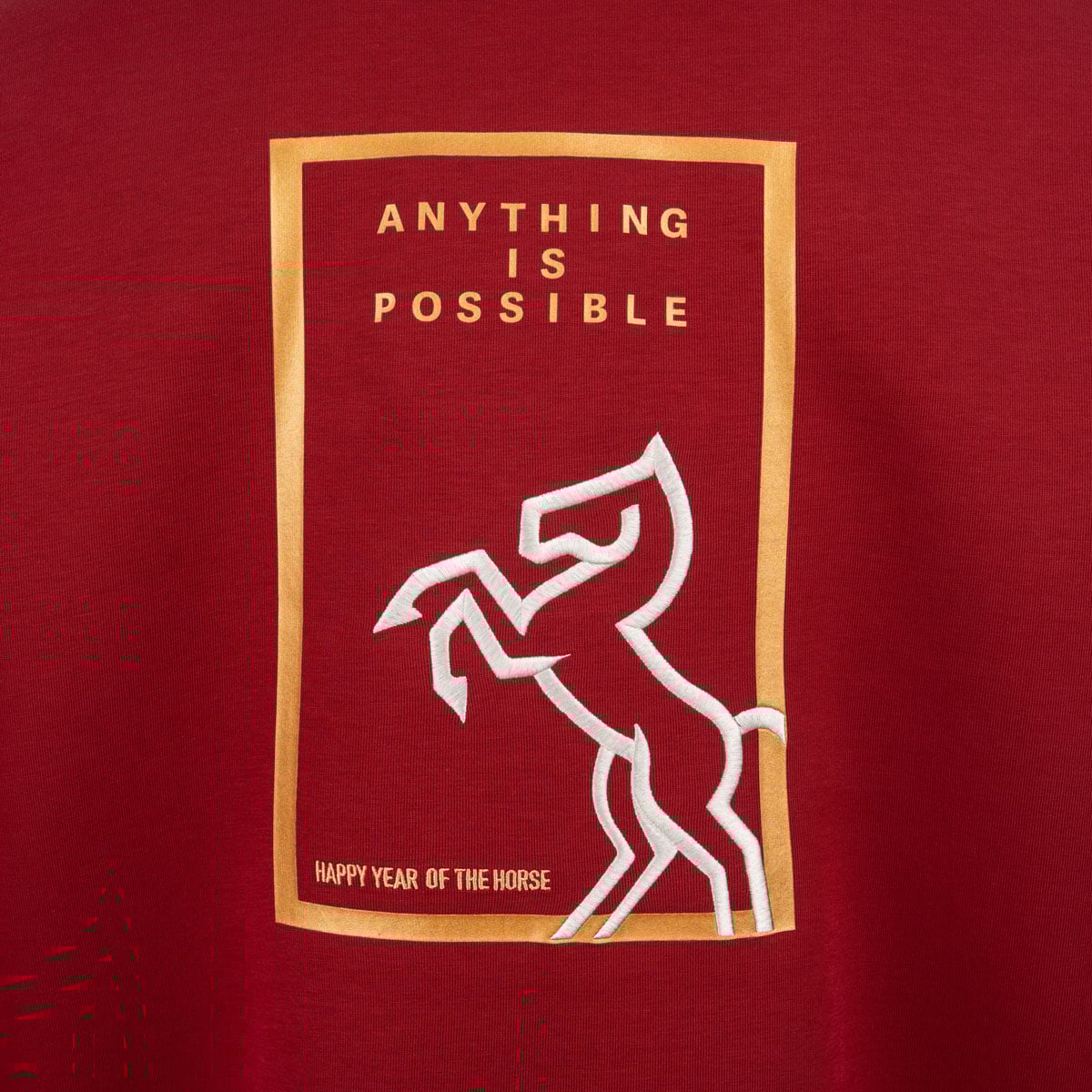 Áo hoodie có mũ mang lại cảm giác ấm áp thoải mái.Trên tay áo thiết kế logo logo đặc biệt kết hợp chữ chữ “马” (ngựa) và hoạ tiết nút thắt Trung Hoa, mang ý nghĩa may mắn, cát tường.Phía sau lưng là hoạ tiết chủ đề năm Ngựa, được thể hiện qua nhiều kỹ thuật thủ công tinh xảo, tạo điểm nhấn sang trọng tinh tế